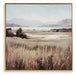 This wall art puts a peaceful spin on hanging decor. Its quiet landscape invites you to a lakeside field, with rolling mountains in the background that bring depth to the design. Hand-painted and gold leaf embellishments make each piece unique.