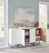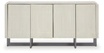 | Details | Made with solid wood and metal, Lightly distressed white finish, Subtle sandblasted effect enhances the wood grain, Metal base with pewter-tone finish, Door fronts with step pattern, 4 doors; 2 shelves, Openings in back for electronics, Assembly required | |