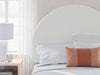 Details B1323-87: Made with durable engineered wood frame covered in a creamy white boucle, Polyester upholstery, ¼" bolts (not included) are needed to attach headboard to your existing bed frame, Minor assembly required, B1323-245: Made with engineered wood (MDF/particleboard/plywood) and decorative laminate for the right balance of affordability and durability, Subtle blush finish over replicated pecan wood grain, Decorative laminate replicates natural or man-made material surfaces with consistent color, pattern and texture, Champagne colored knobs, 5 smooth-gliding drawers, Drawer interiors are lined with a faux linen laminate for a clean, finished look, Safety is a top priority, clothing storage units are designed to meet the most current standard for stability, ASTM F 2057 (ASTM International), Drawers extend out to accommodate maximum access to drawer interior while maintaining safety, Minor assembly required, B1323-91: Made with engineered wood (MDF/particleboard/plywood) and decorative laminate for the right balance of affordability and durability, Subtle blush finish over replicated pecan wood grain, Decorative laminate replicates natural or man-made material surfaces with consistent color, pattern and texture, Champagne colored knobs, 1 smooth-gliding drawer, 1 open shelf, Drawer interiors are lined with a faux linen laminate for a clean, finished look, 2 slim-profile USB charging ports, Power cord included; UL Listed, Minor assembly required, B1323B1: Includes dresser and mirror, Made with engineered wood (MDF/particleboard/plywood) and decorative laminate for the right balance of affordability and durability, Subtle blush finish over replicated pecan wood grain, Decorative laminate replicates natural or man-made material surfaces with consistent color, pattern and texture, Champagne colored knobs, 6 smooth-gliding drawers , Drawer interiors are lined with a faux linen laminate for a clean, finished look, Mirror can be attached to back of dresser or wall mounted horizontally or vertically, Safety is a top priority, clothing storage units are designed to meet the most current standard for stability, ASTM F 2057 (ASTM International) , Drawers extend out to accommodate maximum access to drawer interior while maintaining safety, Minor assembly required,