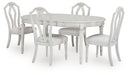 | Details | D795-35: Made with hardwood solids, acacia wood veneer, MDF substrate and cast resin components, Antiqued white finish, Tabletop with butterfly-matched veneer pattern, Removable center leaf, Table extends by pulling both ends and dropping in leaf, Seats up to 6, Dining chairs sold separately, Assembly required, D795-01: Made with solid wood frame and cast resin components, Antiqued white finish, Polyester upholstery, Foam cushioned seat, Includes adjustable levelers, Assembly required, | |