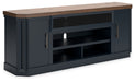 This TV stand combines casual contemporary design with modern appeal. Its combination of a thick-bodied wood-tone top with a slate blue cabinet is a smart choice on so many levels. Stow away electronics in the roomy cabinets, and use the upper shelf to conceal a soundbar speaker for a clean integrated look. Enhancing the experience: the optional fireplace insert (sold separately) brings a touch of warmth and beautiful ambiance to your living room.