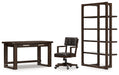 | Details | H556-44: Made with hardwood solids, oak veneer and MDF substrates, Dark brown wood-tone finish, 2 smooth-gliding drawers, Cutout for cord management, Assembly required, H556-01A: Made with solid wood frame, Dark brown wood-tone finish, Foam cushioned seat and backrest with faux leather upholstery, Adjustable height, Casters for easy mobility, Assembly required, H556-70: Made with hardwood solids, oak veneer and MDF substrates, Dark brown wood-tone finish, 4 shelves, Assembly required, | |