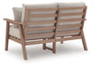 Natural neutrals are all the rage. Embrace the style trend with this outdoor loveseat. Crafted with MEGA-TUFF™ HDPE material, this chair combines the exceptional durability and weather resistance you need with the wood look you love. Comfy cushions wrapped in our high-performing, low-maintenance Nuvella® fabric offer stylish and durable appeal, taking outdoor living to a whole new level. Coordinating accent pillows add a wonderful layer of interest.