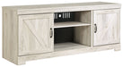 Express your farmhouse style with this TV stand. Its wispy white finish over replicated oak wood grain is a delightful change from the ordinary. Clean-lined, classic styling with barn door inspiration provides a country chic aesthetic that’s a breath of fresh air. Feel free to add an optional electric fireplace for instant warmth and romance. (Compatible with W100-101 and W100-02 fireplace insert models, sold separately.)