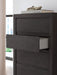 | Details | Made with engineered wood (MDF/particleboard/plywood) and decorative laminate for the right balance of affordability and durability, Dark charcoal finish over replicated oak grain, Decorative laminate replicates natural or man-made material surfaces with consistent color, pattern and texture, Recessed hand grabs create hardware-less effect, 5 smooth-gliding drawers, Drawer interiors are lined with a faux linen laminate for a clean, finished look, Safety is a top priority, clothing storage units are designed to meet the most current standard for stability, ASTM F 2057 (ASTM International), Drawers extend out to accommodate maximum access to drawer interior while maintaining safety, Assembly required | |