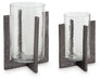 | Details | Set of 2, Made of clear glass with hammered effect, Metal base with antiqued pewter-tone finish, Each holds a 3” pillar candle (candles not included), Due to the finishing process of this product, some variations may occur | |