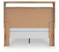 The natural wood tones and clean lines of this queen upholstered panel bed echo your easygoing style sensibilities. With a warm finish and replicated oak grain, its carefree character lightens up your bedroom. Curved inner corner details soften the look, while contrasting brown fabric modernizes the feel. And for added function, warm LED lighting adds serene ambiance at the touch of a button.