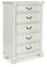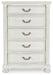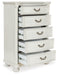 | Details | Made with hardwood solids, veneer and MDF substrate with cast resin components, Antiqued white finish, Metal pulls with polished pewter-tone finish, 5 smooth-gliding drawers with fully finished interiors, Drawers with French/English dovetail construction and heavy-duty ball-bearing side glides (top drawer felt lined), Thick decorative moulding, Reeded bun feet | |