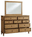 | Details | Includes dresser and mirror, Made with hardwood solids, hickory wood veneer and MDF substrates, Light brown wood-tone finish, Dark bronze-tone drawer pulls, 9 drawers with fully finished interior, dovetail construction and heavy duty ball-bearing side glides (top drawers felt lined), Mirror attaches to back of dresser | |