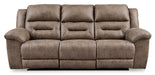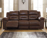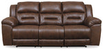 For those who love the cool look of leather but long for the warm feel of fabric, this reclining sofa delivers both with ease. Its high-performance padded faux leather is remarkably durable and easy to clean, making it just the thing for family spaces. Channel-stitched back cushions provide indulgent lumbar support for maximum comfort—not to mention fashion-forward flair.